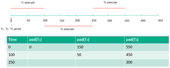 In order to schedule the execution of tasks, we must give the task a scheduling value based upon the characteristics of the task. Therefore, we define the task’s dispatch value as the pad. The PURS scheduling algorithm is based on the size of each task’s pad. The idea of the PURS is to judge according to the urgency and the priority of the task. The smaller the pad, the earlier the task is executed, so here we define the value of the pad as