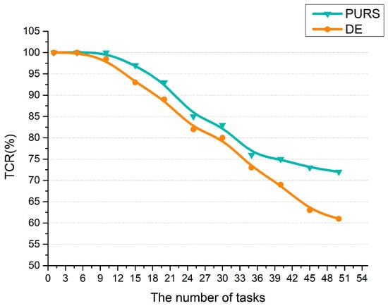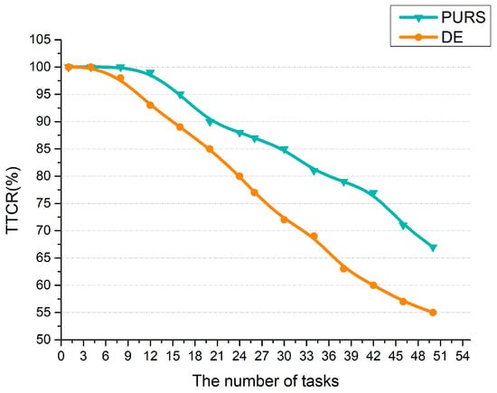 In Figure 3 and Figure 4, in order to verify the advantages of our PURS scheduling algorithm, we compare the direct execution strategy (DE) in the order of reaching the ECS. In the first set of simulations, we set 15 ECSs in the system, 50 tasks in each group, and therefore 750 tasks in total. The ratio of the three priority tasks is CTs:ITs:VITs = 3:1:1. Above all, the two metrics CR and CWCR are compared. As shown in the figure, when the ESCs task is less than 10, the ECSs resources are sufficient to satisfy the task. Hence, the TCR and TTCR of the direct execution strategy and PURS are both 100%. When the number of tasks is greater than 10, on account of the arrival of some high-priority tasks in the waiting queue, sequential execution cannot meet the time constraint requirements of these high-priority tasks. After being scheduled by the PURS algorithm, tasks with high priority and high urgency can be effectively performed to satisfy most tasks. However, as the number of tasks increases, the computing resources of ECSs tend to be exhausted, and both TCR and TTCR will decrease. Yet, the execution order of the task scheduled by PURS is obviously better than the direct execution strategy. At this time, individual ESCs cannot satisfactorily perform tasks through the scheduling algorithms. Therefore, other ESCs are needed to assist in the migration of some short tasks to other ECSs.