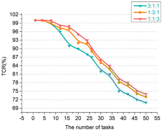 In order to compare the scheduling capabilities of the PURS for different priority tasks, we reset the task priority ratios to CTs:Its:VITs = 3:1:1, CTs:Its:VITs = 1:3:1 and CTs:Its:VITs = 1:1:3. By comparing the size of TCR under different priority task ratios, the PURS is in line with the requirements of automatic driving task processing and perform better when scheduling multi-tasks with higher priority. As is shown in Figure 5, high-priority tasks are produced most by self-driving vehicles during driving. However, as the number of tasks increases, a single ECS cannot satisfy a large number of simultaneous tasks. Therefore, multiple ECSs need to cooperate directly.