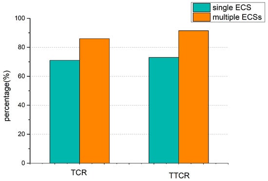 When a single ECS cannot complete a growing number of tasks, we can offload some short tasks of the current ECS to the nearby ECS, and set 10 ECSs in the system, 50 tasks in each group, and thus, 500 tasks in total. The ratio of the three priority tasks is CTs:Its:VITs = 3:1:1. We directly compare the TCR of a single ECS and multiple ECSs under multitasking. As can be seen in Figure 6, the coordinated scheduling between multiple ECSs significantly increases the completion rate of the task, which is close to 90%. In practice, more ECSs can be deployed on the roads with more vehicles based on actual conditions, further improving the task completion rate.