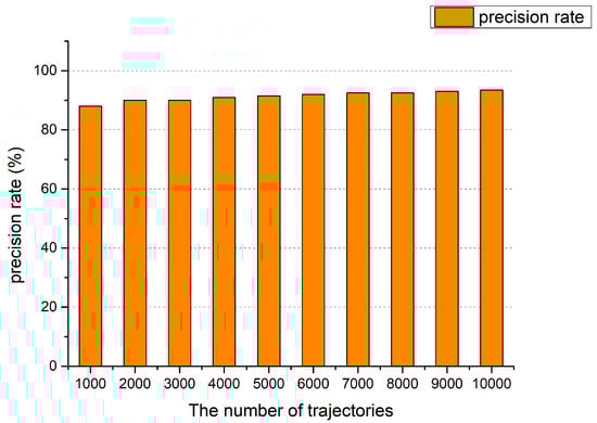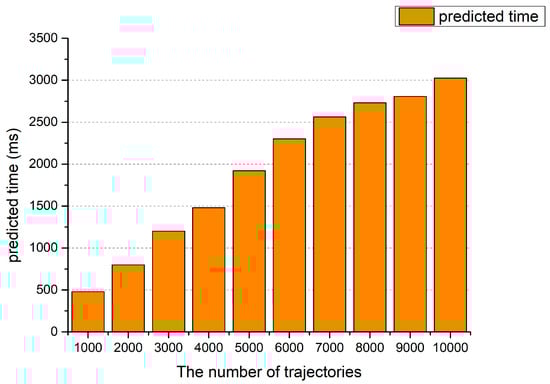 Figure 7 and Figure 8 focus on the performance of track prediction algorithms. When the task is completed, our Kalman filter is used to predict the position of the vehicle. We obtain the prediction accuracy and prediction time under different data sets through experiments. When the number of predicted track segments increases, the accuracy rate also rises slowly.