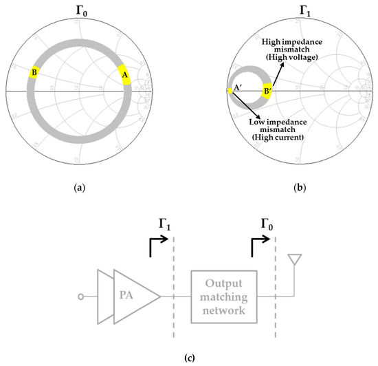 Two impedance mismatch cases that can cause power amplifier (PA) failures: (a) mismatched impedance at antenna terminal (Γ0); (b) mismatched impedance at PA’s final stage (Γ1); (c) reference planes of (a) and (b).