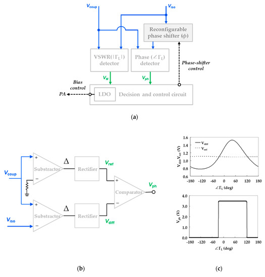 Figure 4b shows the block diagram of the ∠ΓL detector and it extracts ∠ΓL position using the fact that the difference between Vcoup and Viso is a function of the load phase. As shown in Figure 4c, Vph (phase detector output voltage) with high value in a specific ∠ΓL section was generated by comparing Vdiff, which is the difference between Vcoup and Viso, and Vref, which is a reference. Therefore, if Vph has a “high” value, it means that the current load phase belongs to the specific phase section, and if it has a “low” value, it means that it is outside the section. In addition, by using a phase shifter at the input of the ∠ΓL detector as shown Figure 4a, it was possible to adjust the detection target phase section. The detailed configuration of the reconfigurable phase shifter is shown in Figure 4d, which was adaptively controlled by the control circuit to define various load phase sections. Two Vph detections by changing the phase of the phase detector allowed the combination of the results to determine where the current ∠ΓL belonged to among the four preset phase section regions. Figure 5 illustrates the process of determining which region the current ∠ΓL belonged to, assuming that the │ΓL│ was determined by the │ΓL│ detector. Table 1 shows an example of detecting load impedance section from the Vph value set obtained from a procedure shown in Figure 5a. The designation of the impedance area to be detected could be easily set in any area through the design of the │ΓL│ detector and the ∠ΓL detector, and the size of the detection area could be adjusted according to the situation by using a reconfigurable phase shifter which was controlled through the mobile industry processor interface (MIPI). The more detailed operating principles of this technique have been previously provided [14,15].