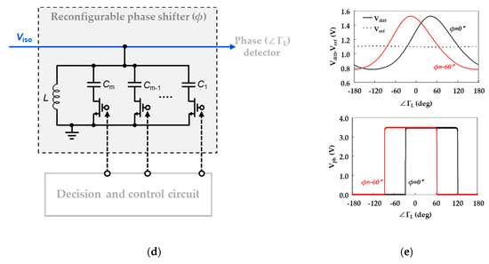 (a) Proposed mismatch impedance detector; (b) block diagram of phase detector; (c) simulated Vdiff, Vref and Vph; (d) reconfigurable phase shifter configuration; (e) simulated Vdiff, Vref and Vph for two phase values of phase shifter.