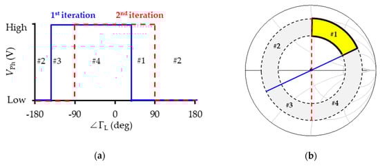 The mismatch impedance detector sensed the │ΓL│ and ∠ΓL, respectively, and used a combination of the two results to determine if the load impedance was in the failure area. The proposed mismatch impedance detector was composed of a │ΓL│ detector, a ∠ΓL detector including a phase shifter, and a control logic circuit that controlled the phase shifter to define various impedance sections to detect as shown in Figure 4a.