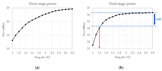 Simulation result of: (a) drive stage power over the drive base bias voltage (Vreg, drv); (b) final stage power over Vreg,drv.