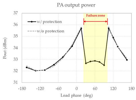To confirm that the ruggedness of PA was improved, measured output power was compared with and without the protection technique using the measurement setup where all instruments were controlled by a dedicated program shown in Figure 9. The measurements were performed at mismatched condition using a 5 MHz 1 RB long-term evolution (LTE) signal of 10 dBm over collector voltage (Vcc) at 2017.5 MHz (Band 34). When the closed-loop protection technique was deactivated, the PA module was damaged over a certain ∠ΓL range (30° < ∠ΓL < 90°) with │ΓL│ > 0.6. After confirming the location of the failure zone, the mismatch impedance detector was set to identify whether ΓL was in this area or not through MIPI. Since the detector’s output could be unstable when the load impedance was at the boundaries of the predetermined impedance sections, the detector was designed to have hysteresis characteristics to avoid this situation. As a result, the module activating the protection technique survived at higher Vcc condition than when the technique was deactivated. Figure 10 shows the measured output power comparison between activating and deactivating the proposed technique at │ΓL│ of 0.7 under Vcc of 5.5 V. When protection was not applied, the PA was damaged in the failure impedance zone and did not provide normal power. However, when protection was applied, the PA output power was sufficiently backed off and a PA failure did not occur. From the comparison, it was confirmed that the proposed technique improved the ruggedness of the PA.