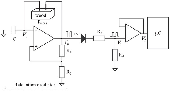 Assuming that the saturation voltages in the operational amplifier are symmetrical, the oscillation period T in linearly depends on according to Equation (2). Thus, by measuring T we can obtain , that is, the wood resistance value.