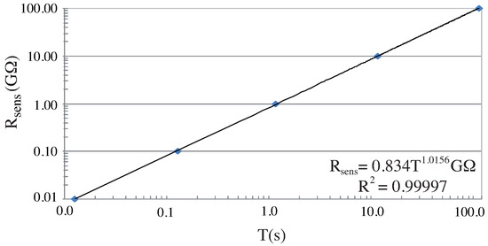 Experimental relation between and T using the proposed AC method. As seen, the obtained period T is directly related to in the whole measurement range [10 MΩ, 10 GΩ] and can be linearly interpolated.
