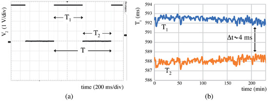 Third, a study of the capacitor charge and discharge times ( and ) using the resistance decade box was made. Figure 3a shows the output voltage for , where and are indicated. Theoretically, and must be equal; however, due to slight differences in real and values, and can be slightly different. Figure 3b shows measured values of and for during 200 min. As seen, and are not exactly equal, having an average difference of ms. In case of , a ms was obtained, which supports the theoretical equations, that is, the time required to reach or increases with and thus, also increases.