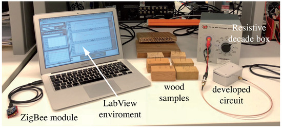 - Transient response test: The value for all wood species was measured every 15 s during 20 min from the beginning of circuit functioning. 96 h before the measurements took place, laboratory temperature and relative humidity were kept approximately constant (temperature ranged from 24 °C to 26 °C and ambient humidity from 58% to 62% ). During measurement, a nearly constant temperature was maintained in the laboratory (±1 °C). These measures were performed both with the proposed method and with the traditional DC method. Figure 4 shows the used test-bench for the proposed method, where the analogue circuit described in Section 2 is connected to a microcontroller which is also connected to a computer via ZigBee (wireless communication protocol). For the DC method, an electrometer (Keithley K6517A, measuring resistance in the range , with a 0.5% precision), with V was used. In both cases, data were displayed and recorded in a computer using a custom developed application under LabVIEW software.