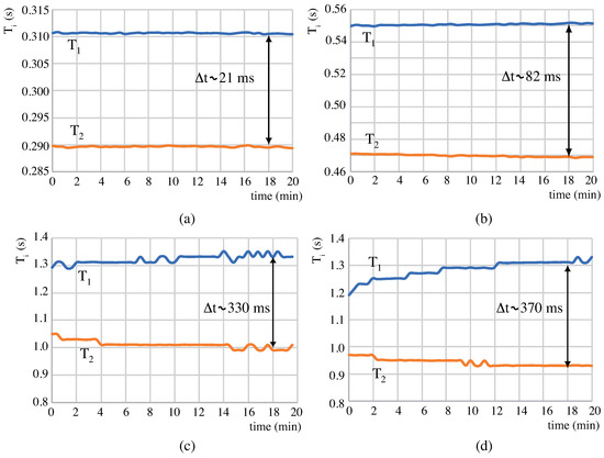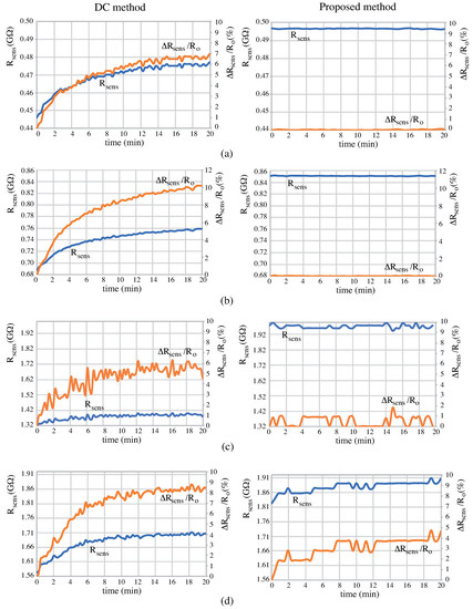 For all analysed wood species, it is clearly seen that the measured value is very stable for the proposed method, while the DC measured value tends to increase with time. This is a polarization effect, which is cumulative in time as the electrical charges in the wood are not modified in the DC method. This effect is clearly visible in Douglas-fir (Figure 5a, variation in DC versus in the proposed method) and Sweet chestnut (Figure 5b, versus ), while minor variations were obtained for Maritime pine (Figure 5c, versus ) and European ash (Figure 5d, versus worst-case). As seen, while the wood species varies the result, the proposed method provides a more stable behavior in all cases.