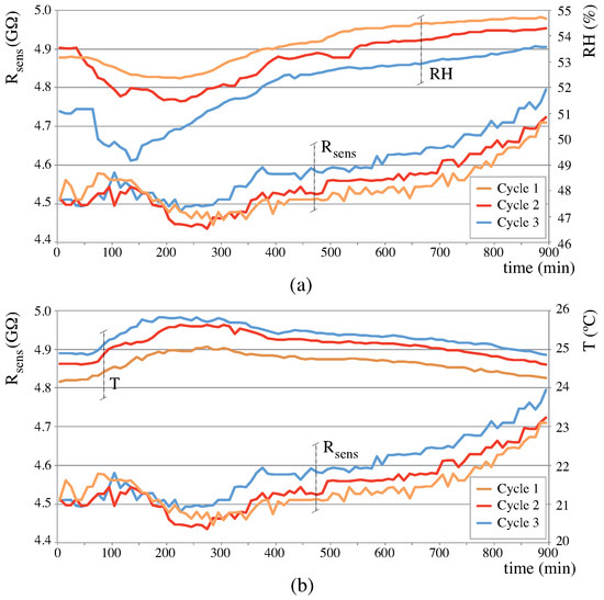 For this analysis, only the Maritime pine in two different pieces with the same geometrical dimensions (samples A and B, Table 2) and with different initial conditions were used. Sample A resistance was measured during three days in 15-h cycles with a 9 h rest cycle. In total, three 15-h cycles were performed during 3 consecutive days. Ambient temperature ranged between 24 °C and 26 °C and ambient humidity from 49% RH to 55% RH. Figure 7 shows the measured evolution with the ambient temperature (Figure 7b) and RH (Figure 7a). As it can be seen, the resistance value is almost the same at the beginning of each cycle (4.54 GΩ, 4.51 GΩ, 4.51 GΩ) and the value changes in time following the temperature and RH variations as described in the literature [3,4,8]. Even small changes in environmental conditions (either temperature and/or RH) can be detected by a modification in the value.