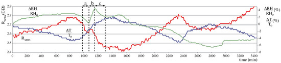 The of sample B for the Maritime pine, continuously measured each and every minute during 58 h, was obtained. One week later, a 62-h measurement was also performed. Figure 8 and Figure 9 show measured along with temperature and RH percentage variation for each experiment. In both cases, the value inversely follows the temperature changes, which is a normal behaviour in wood. For this reason, wood MC estimation from resistance value must consider the temperature [3,4,8]. When RH variation is not significant, it can be seen that follows temperature variations as described in the literature. However, when RH variation is more significant, the value is affected (see Figure 8, zones a, b, c).