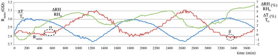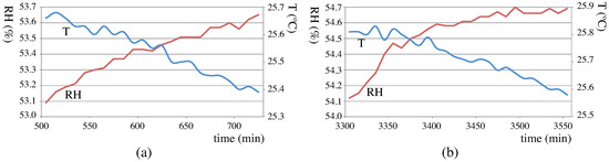 There are two specific time segments marked as and in Figure 9, with about two hours duration each. They are shown in detail in Figure 10. During these time segments, variation in resistance is almost zero and corresponds to a moment when temperature and RH are converging. Then, the rising temperature is compensated by the RH decrease, resulting in nearly constant value. As a result, we must consider that an increase in RH affects the MC in wood (at least on its surface) and reduces its electrical resistance, which is also consistent with literature.