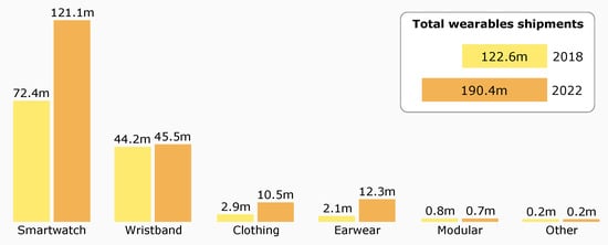 The definition of the term wearable encompasses different kinds of devices, from the ones that are placed on the feet, such as shoes that include motion sensors, to devices that are placed on the head, such as smart glasses or caps that detect drowsiness and alert drivers [], going through devices that are placed on any other part of the body halfway. However, the devices that are really succeeding in the consumer market are smartwatches and smartbands, i.e., wearables that are placed on the wrists of their owners. Figure 1 summarizes the number of wearables sold in 2018, together with an estimation of sales in 2022, about several types of wearable devices (data from International Data Corporation Worldwide Quarterly Wearable Device Tracker []). As the figure depicts, a very high percentage of the sales, 87.5% (166.6 M), corresponds to wrist-worn wearables (i.e., smartwatches and wristbands), while the rest (clothing, earwear, modular and others) represent only a 12.5% (23.7 M) of the shipments.