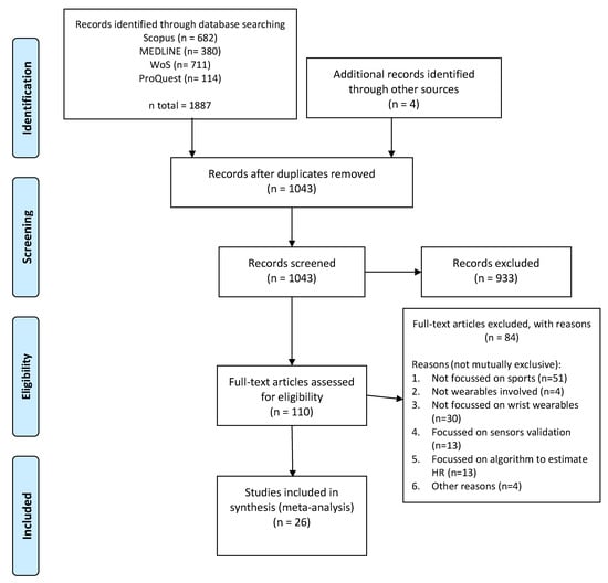 The objective of this work was to carry out a systematic review, according to the PRISMA methodology, to analyze and combine the results of independent studies about innovative uses for wearable wrist technology in the field of sports. As shown in Figure 2, during the searching phase, 1887 articles in the target databases and 4 additional works in external sources were identified, 3 in surveys related to portable devices and 1 contribution to a conference found in Google Scholar using a query similar to the original one. After duplicate removal, 1043 papers were title and abstract-screened by the authors, who graded them with a value between 0 and 5 according to their relevance. 524 papers scored 0; 246 got a score of 1;166 a 2; 66 scored a 3; 32 a 4, and finally 12 works received a score of 5.