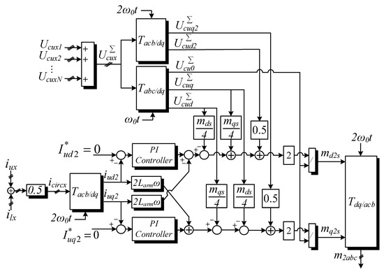 Then, harmonic components of the upper arm current, modulation index, and sum capacitor voltage are considered based on Equations (1), (4), and (6) respectively. Thus, for the upper arm, Equation (10) can be rewritten in dq0 frame as follows: