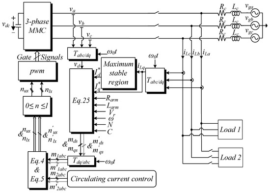 On the other hand, is considered as the MMC output voltage at PCC. In this regard, applying KVL to the circuit structure of the proposed MMC-based STATCOM represented in Figure 1a yields to: