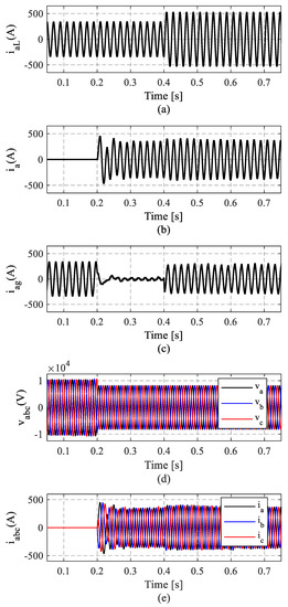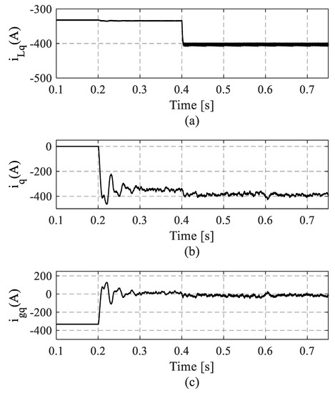Figure 7 illustrates reactive current components of the simulated system in dq0 frame. As mentioned before, load reactive power demands (even after load increment at 0.4 s) are considered to be less than the converter’s maximum power transfer capability. At the same time, providing reactive power demands of the load is considered as the first priority of the proposed MMC-based STATCOM model. Therefore, it can be seen that after MMC connection at 0.2 s all reactive current demands of the load are compensated through the energy source (see Figure 7a,b respectively). This yields to an almost zero reactive current flow in the grid side after the MMC connection, which is clearly shown in Figure 7.