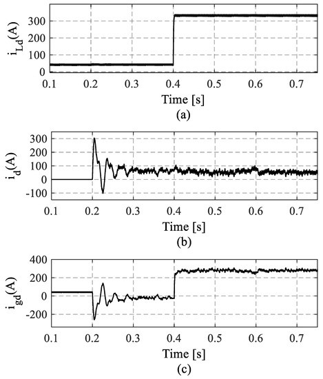 On the other hand, active current components of the simulated system in dq0 frame are demonstrated in Figure 8. As it can be seen, grid current supplies active power demands of the load before 0.2 s as the energy source is not connected yet. During the time interval of 0.2 < t < 0.4 s the energy source provides maximum established active power, keeping the grid current at the lowest level. As the load demands are increased after 0.4 s, converter current waveform remains almost constant, which can be seen in Figure 8a,b respectively. This is due to the active power margin specification of the MMC, which depends on the maximum available power left after providing all load reactive power demands. Therefore, the grid current increment after 0.4 s is justifiable due to the abovementioned explanations and it is less worrying since the grid power factor is not decayed.