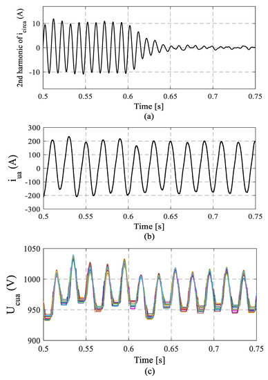 As another contribution of this paper, circulating current control was applied during the 4th interval of the simulation time. As can be seen in Figure 10a, applying the proposed circulating current control after 0.6 sec can lead to a 90% reduction in the second harmonic component of arm current. This is while most recent studies of the same field have been unable to provide such mitigations in harmonic components of arm currents. For example, reference [33] proposes a unified on-line calculation scheme by using the instantaneous information of MMC in order to achieve different circulating current injection targets under different conditions. In this regard, four circulating current control targets have been considered. The comparisons between the obtained circulating current waves and the uncontrolled one show that the largest decrease in the circulating current value can be achieved under the first scenario and with the amount of 50%. As another example, reference [34] employs a feedback linearization-based current control strategy in order to regulate the output and inner differential currents of the MMC. Furthermore, the conventional cascaded controller is also considered where the differential current is only regulated by PI controller. A comparison of the obtained results shows that the harmonics in the differential current are reduced from 25% to 3.22% with the aid of the feedback linearization method. This is while the proposed circulating current control in this paper leads to a final 0.5% circulating current remaining in the total arm current, and therefore, shows an effective improvement in circulating current mitigation over the previous methods represented in various recent studies. It should also be noted that the additional second harmonic component of modulation indices generated by the controller can improve arm current adjustments as well as reduce the capacitor voltage fluctuations. The abovementioned results are demonstrated in Figure 10b,c respectively. It should be noted that circulating currents are considered as interior quantities. Therefore, the applied control algorithm has no direct effect on converter outer dynamic performances which is clearly reflected in Figure 6b,d,e.