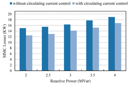 In order to evaluate the beneficial effects of the proposed circulating current control on MMC loss reductions, several studies have been accomplished. In this regard, MMC loss calculations have been performed considering a fixed load active power demand of 0.5 MW as well as various load reactive power demands. Figure 11 demonstrates the MMC losses, with and without circulating current control for five different values of reactive power. As it can be observed from the figure, the losses are decreased by more than 10% (and up to 16% in the first two reactive power amounts) due to mitigation of circulating current. This is while most recent studies in this field are suggesting less than 10% reductions in converter losses, using various second harmonic current control approaches [35,36]. Therefore, MMC loss evaluations provided in Figure 11 confirm that the proposed method can effectively improve converter operation in power loss terms, as well.