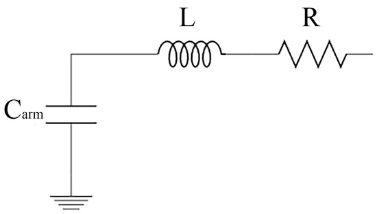 During controller design, a simplified model of converters reduces the computational time. Therefore, an equivalent (Resistant-Inductance (L)-Capacitance) RLC model is suggested in [24], as depicted in Figure 3. A technique to model the effect of converter capacitors is to consider the reducing trend of the converter voltage. An MMC has several arms and submodules. Thus, the maximum amplitude of the generated voltage by one converter’s arm is the total of the available arm voltage. The arm voltage variations of a converter in terms of the current can be obtained by: