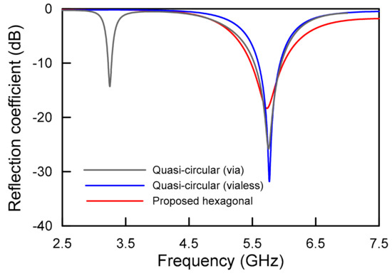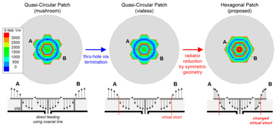 As expected, the ZOR mode yields parallel resonance from the shunt inductance (caused by the thru-via hole) and the shunt capacitance between the patch metal and mesh ground metal [19]. In addition, the hexagonal patch also supports the fundamental mode, that is, the half-wavelength resonant mode of the TM01 mode, and thus the linearly arranged three hexagonal patches can make an over-wavelength TM02 mode for omnidirectional radiation. As shown in the middle of Figure 2, the via-removed hexagonal mushroom resonator only gives a TM02 mode. As shown on the right side of Figure 2, we finally reduced the hexagonal radiating patch to the trapezoidal radiating patch, that is, the linearly tapered radiating patch. This cutting design using geometrical symmetry provides the advantages of an enlarged bandwidth and a miniaturized size of the radiating patches compared to the conventional hexagonal patches. The simulated results for the comparisons in Figure 2 are shown in Figure 3. Accordingly, the proposed antenna can accomplish a successful TM02 mode for omnidirectional radiation.
