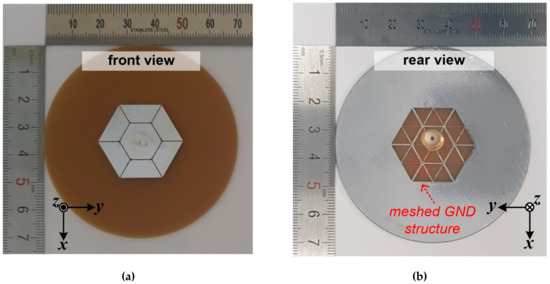 To verify the design feasibility, a proposed antenna prototype was fabricated, as shown in Figure 4. The fabricated prototype had the dimensions in Table 1 for the meshed ground structure. The meshed ground structure was successfully implemented as shown in Figure 4b. After etching the proposed antenna, a commercial semirigid standard coaxial cable with a length of 7 mm was mounted.