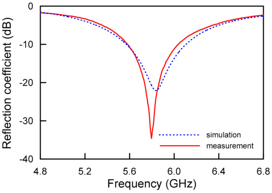 Figure 5 displays the reflection coefficients of the proposed antenna. The measurement results of the fabricated prototype agreed well with the simulations for the proposed antenna. For the simulation, the results were observed at 533 MHz from 5.573 GHz to 6.106 GHz with respect to about 9.13% at a center frequency of 5.840 GHz. The measurements were taken according to the 10-dB impedance bandwidths of 452 MHz from 5.583 GHz to 6.035 GHz with respect to about 7.78% at a center frequency of 5.809 GHz for the TM02 mode. The slight gap between the simulations and measurements was the result of inexact alignment between the top patch plane and the bottom mesh ground surfaces during the process.