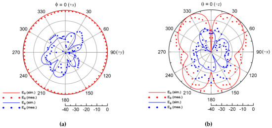 At a test frequency of 5.84 GHz, the directivity of the proposed antenna was different from that of an ideal monopole (that is, an electrically small antenna) due to the radiator at a wavelength of 1.5. At θ = 30° in Figure 6b, the horizontal polarization(Eϕ), that is, the cross-polarization of the proposed antenna, was observed at -20.64 dB with a normalized radiation pattern.