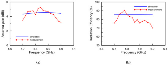 Figure 7 shows the realized antenna gains and radiation efficiencies of the proposed antenna. The realized antenna gains were measured at 5.27 dBi and 5.84 GHz in 1.5-wavelength resonant TM02 mode. For the simulations, the realized antenna gain was 4.53 dBi at 5.88 GHz. As expected, the measurement antenna gains were almost identical to the simulations for the TM02 mode. The reason for the difference between the simulation and measurement experiments of the antenna gain around 6 GHz seemed to be due to the additional losses of the 50-ohm coaxial cable used as the feed line. As shown in Figure 2b, it can be seen that the simulation results of the radiation efficiency remained constant at 85.47%. On the other hand, the measurement results of the radiation efficiency showed variation between the maximum value of 90.61% and the minimum value of 75.69% (according to the frequency). The deviation between the simulation and measurement results was a reasonable value within the calibration error range that occurs in the anechoic chamber.