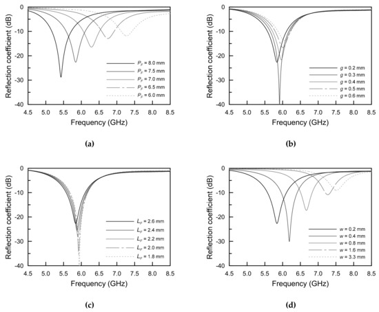 Figure 8b exhibits the change in the reflection coefficients of the proposed antenna when the gap size of g between each patch varied from 0.2 mm to 0.6 mm. Since the gap g generates coupling between patches, it can be seen that the amount of electrical coupling varied with the gap size of g. Therefore, if the operating frequency is determined through the proposed antenna radiator and feeding patch of PF, the gap g should be optimized to generate the maximum coupling coefficient.