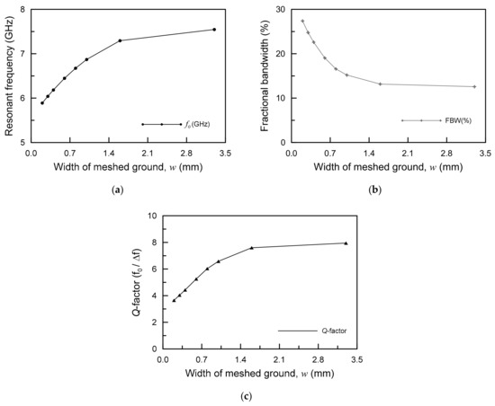 Accordingly, when w changed from 3.3 mm to 0.2 mm, the Q-factor calculated by the ratio of increased 3-dB fractional impedance bandwidth and reduced resonant frequency went from 7.95 to 3.65. In other words, the Q-factor of the proposed antenna with the mesh ground structure was reduced by 54% compared to normal ground, and an effect of about 2.67 dB was obtained, as shown in Figure 9c. As a result, the Q-factor of the proposed antenna was reduced by the decreasing w, and the electrical performance (such as the 10-dB impedance bandwidth) of the proposed antenna was greatly improved due to the meshed ground structure.