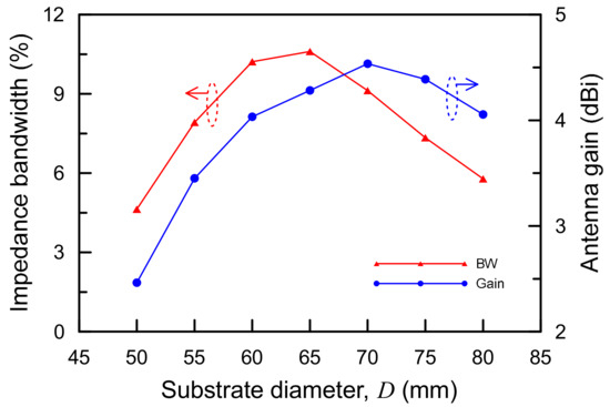 10-dB impedance bandwidth and realized antenna gains of the proposed antenna with a substrate diameter of D variation from 50 mm to 80 mm.