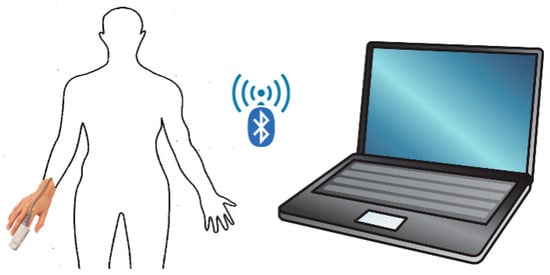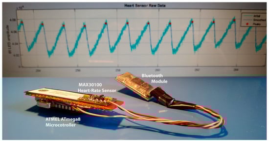 The second system comprises from a low-cost portable accurate PPG electronic device which measures the heart rate from the individual’s finger and a host (PC, laptop, etc.) where signal processing and NTA were performed offline. This device was designed and assembled in Electronics-Telecommunications and Applications Laboratory of the Physics Department, University of Ioannina, Greece while the accuracy of the initial device, in terms of heart rate measurements, has been confirmed in [] (where comparison of the RR intervals in ECG and oximeter signals has been made). Figure 2 shows the connection between PPG and a laptop while the prototype electronic device is shown in Figure 3. The PPG device is comprised of two parts. The first one includes a finger heart rate monitor sensor based on the MAX30100 module from Maxim Integrated Company which is using the PPG technique. It combines two LEDs (Light Emitting Diodes), one emitting red light, and another emitting infrared light. We used the infrared light since we found better PPG signal instead of the red light. Furthermore, it has a photodetector, optimized optics, and low noise analog signal processing to detect heart rate signals. Although the sampling rate is up to 1000 samples per second, after testing different sampling rates, we set it to 400 samples per second having high measurement accuracy with smaller data storage files and faster processing speed. Furthermore, the MAX30100 includes a proprietary discrete time filter to reject 50 Hz interference and low-frequency residual ambient noise. The second part includes the ATMEL ATmega8L, a low-power CMOS 8-bit microcontroller based on the AVR RISC architecture. It was programmed to collect the raw data from the sensor module and transfer them to the laptop via Bluetooth communication.