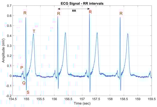 QRS complex is the most prominent ECG wave for signal analysis and the accurate detection of its R peak is essential for the ECG analysis algorithms []. Figure 4 illustrates an ECG signal from a healthy individual’s body which was taken from the conventional system.