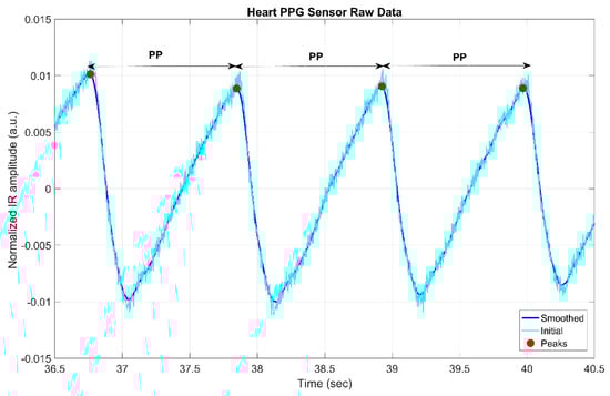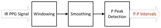 Figure 6 shows the block diagram of the PPG technique. The algorithm for the detection of the P peaks includes the following steps: first, we applied a moving average window for smoothing the signal. The data were smoothed using a moving average filter. The filter had 40 points corresponding to time length of 0.1 s, as the sampling rate was 400 sps. As the volunteers were in resting stage, without e.g., muscle movements, the PPG signal-to-noise ratio was high, and the algorithm used only a smoothing code to eliminate the extra noise spikes. Next, we applied a code searching for local maxima, i.e., finding a peak inside a small frame of time, usually 0.5 s, in which we expected only one P peak. After testing different sampling rates, we concluded that we had the best accuracy speed at 400 samples per second.