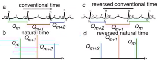 Figure 7 illustrates an example of converting a conventional ECG signal to NTA. The quantity Qm is quantified to a first approximation by the distance between two consecutive R peaks in the conventional time (Figure 7a). The reading in NTA is indicated in Figure 7b where the length of each RR distance corresponds to the energy of the event on the vertical axis, while on the horizontal axis the events are placed equidistant in the same sequence that they appeared (see Chapter 2 of []). Thus, the three distances Qm, Qm+1, and Qm+2 correspond to three events with their respective energy. In the conventional time the ECG reading upon time reversal is plotted in Figure 7c. By the same procedure, we converted it to NTA upon time reversal in Figure 7d. In other words, the last event becomes first, the penultimate second, and so on [].