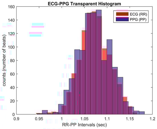 It has been demonstrated that the PPG signal can replace the ECG recordings for the extraction of HRV indices, especially in monitoring healthy individuals at rest [,]. For proving the similarity between ECG and PPG signals, we took the RR and PP intervals from our recorders for a randomly chosen healthy subject, and applied the transparent histogram, as shown in Figure 8. The recording time was 20 min and the number of samples was 1117 for each case. As shown in Figure 8, both signals result in histograms that are close. The mean value for ECG was 1.073 s and 1.073 s for PPG while the standard deviation for ECG was 0.033 s and 0.036 s for PPG.