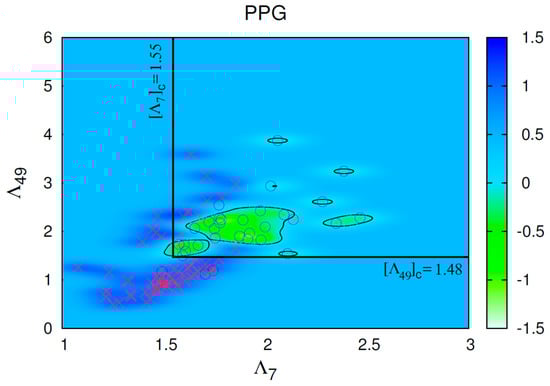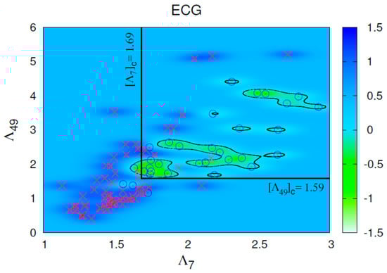 In an attempt to obtain a better classification between CHF and H, we also employed the method of SVM [,,,,,,]. When the decision function of Equation (12) equaled +1 we assigned the point with coordinates (Λ7,Λ49) to CHF, while when it equaled −1 to H. In Figure 9 and Figure 10, the color contours correspond to the argument of the signum in the decision function of Equation (12). We varied in order to obtain the maximum accuracy A which is the ratio of the sum of TP plus True Negatives (TN) over the totality of the cases examined, A = (TP + TN)/(P + Q): for we obtained for PPG the value A = 93% (one CHF mixes with H and six H mix with CHF, see the contours in Figure 9), while for we obtained for ECG the value A = 95% (one CHF mixes with H and four H mix with CHF, see the contours in Figure 10).