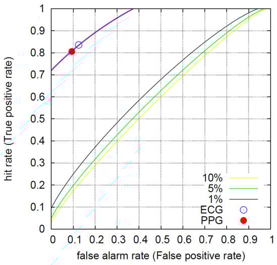 Receiver Operating Characteristics (ROC) diagram depicting the operating points when using PPG (red filled circle) or ECG (blue open circle) data according to the separation between CHF and H obtained by means of [Λ7]c and [Λ49]c in Figure 10 and Figure 11, respectively, together with the corresponding ROC curves (red and blue, respectively) estimated on the basis of confidence ellipses []. The other three curves (yellow, green, black) correspond to the p-values 10%, 5%, 1%, respectively, when 67 (= P) CHF individuals are to be selected out of 99 (= P + Q) cases []. The p-values obtained for both PPG and ECG are well below 0.01% while the corresponding AUC are 0.953 and 0.954, respectively.