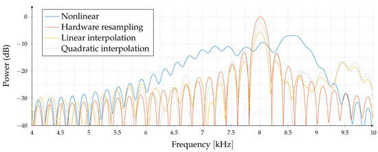In Figure 3, we have a nonlinear VCO simulation for , where , and is the chirp duration. The blue line is the spectrum of the beat signal without any correction. Note that the peak location and, hence, the range estimate has about 10% error. The red line is the spectrum for true hardware resampling, i.e., sampling the beat signal nonuniformly. The orange and dotted lines correspond to the spectrum of linear and quadratic interpolation of a uniformly sampled beat signal for a moderate sampling rate of . Compared to true nonuniform sampling, we observed weaker main lobes, and more side lobes in linear and quadratic interpolators.