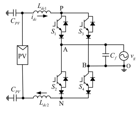 Figure 1 is a schematic of the conventional current-source inverter circuit. Where, Ldc1 and Ldc2 are DC-side inductors, S1–S4 are IGBTs (Insulated Gate Bipolar Transistor), Cf is the AC-side filter capacitor, vg is the AC-side voltage, and CPV is the parasitic capacitance between the PV array and the ground. The voltage change across the parasitic capacitance CPV will cause a leakage current, which will affect the grid current.