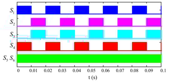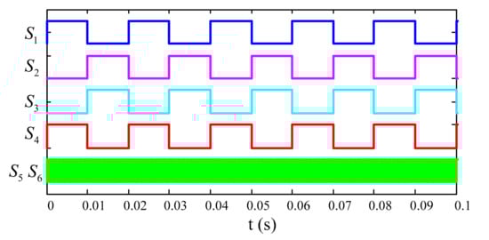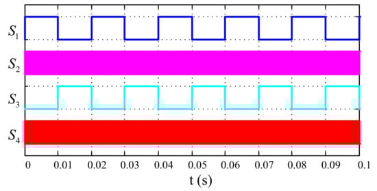 According to Figure 8, when the system operates in the zero state, the potential at point A is vg, the potential at point B is 0, the point P and the point N are clamped at point M, and the potential at point M is vg/2. Therefore, in the zero state, if the switch S1 and the switch S4 are in the on state, the diodes D1 and D4 are reversely turned off, and the upper arm and the lower arm are still in the off state, and the circuit is as shown in Figure 9. The switch S1 and the switch S4 can always be in the on state during the half-positive cycle. In a similar manner, for the half-negative cycle, the switch S2 and the switch S3 can always be in the on state. The switching states of the new modulation method can be obtained, as shown in Table 3. Figure 10 shows the gating signals’ waveform when using the new modulation method. It can be seen that the switches S1–S4 vary by low frequency, and the switching loss is reduced.