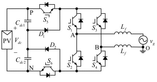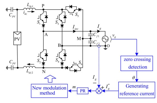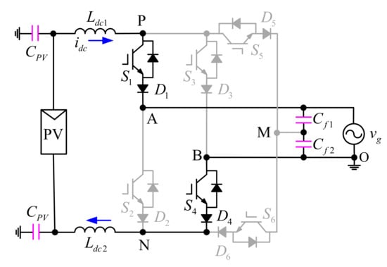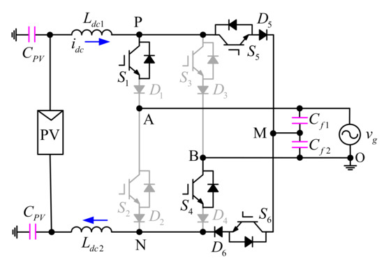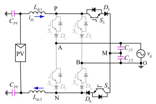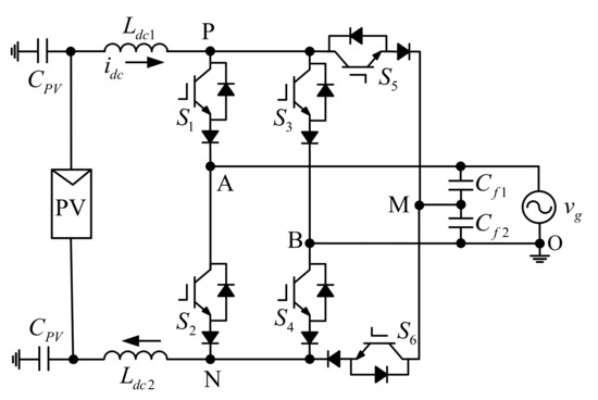 Photovoltaic (PV) power generation is one of the ways to effectively use energy. Through photovoltaic panels to obtain energy, photovoltaic systems can provide green sustainable solutions [1,2]. In general, energy can be obtained from photovoltaic panels by grid connection of photovoltaic inverters or by connecting transformers. However, the transformer is relatively heavy, sizable, and costly, with undesirable power loss problems. Therefore, the transformerless PV inverters are promising and attractive in industrial and academic fields [3,4,5,6,7]. However, when the transformerless PV inverter is connected to the grid, there are still many technical challenges to be solved, such as the leakage current or ground current. Without the transformer isolation, the electrical connection exists between the photovoltaic panel and the grid, and a leakage current will be generated on the parasitic capacitance between the photovoltaic panel and the ground. Leakage currents can adversely affect grid current, personal safety and electro-magnetic interference issues. So, the German standard VDE 0126-1-1 defines that the PV system should be off from the grid when the leakage current exceeds 300 mA.