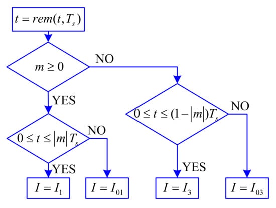 In this section, a system experiment setup was built, and the proposal was compared against the traditional method. The algorithm is realized by the DSP (TMS320F28335) and FPGA (Xilinx XC6SLX9). The experimental parameters are shown in Table 4. Figure 11 shows the control diagram of the proposal. The phase angle θ is detected to generate the reference current. The output m of the PR (Proportional Resonant) regulator is used as the input of the new modulation method. The new modulation method judges the positive or negative of m and selects the corresponding switching sequence. The specific switching sequence selection is shown in Figure 12, where Ts represents the switching period.