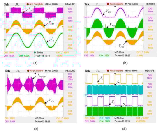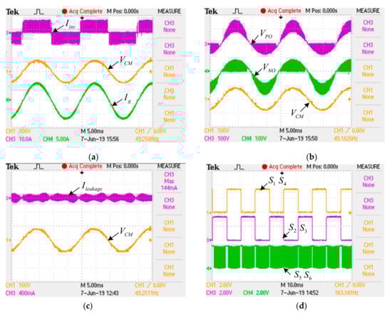 The output current Iinv and the grid current Ig are shown in Figure 14a. From Figure 14d, the switches S1-S4 operate in power frequency, which reduces the switching loss. Figure 14b is the experimental result of the voltages VPO, VNO and the common-mode voltage VCM. The common-mode voltage is the half-grid voltage, ignoring the effect of the fundamental-frequency component of the common-mode voltage on the high-frequency common-mode behavior. According to Equation (5), the leakage current is able to be attenuated. The experimental waveform of the leakage current Ileakage is shown in Figure 14c. The maximum value of the leakage current is 144 mA, which meets the standard and is less than 300 mA, which is satisfactory in terms of the VDE-0126-1-1.
