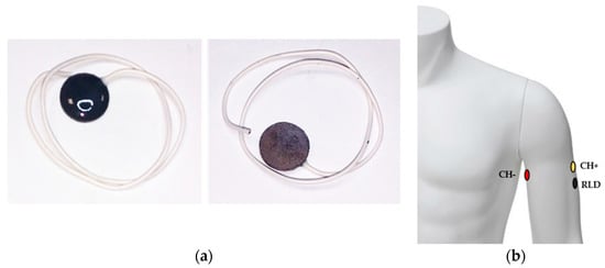 More specifically, we decided to use 10-mm sintered silver–silver chloride electrode disks (Figure 2a), which proved to be more electrically stable for long-term operation than Ag/AgCl electrodes manufactured with a galvanization process [,], offering advantages of relatively low impedance, being re-usable (in one subject) and long-lasting. They also have a non-polarizable behavior and higher mechanical stability than regular silver–silver chloride electrodes []. Furthermore, sintered Ag–AgCl electrodes are increasingly being used for measurements of very low amplitude biopotential signals []. Nevertheless, due to the rigid nature of the electrode–skin interface in dry electrodes, they are more prone to present motion artefact and ECG baseline instability problems. To mitigate the latter issue, it is helpful to restrict the bandwidth of the ECG signal monitoring to between 0.5 and 40 Hz at the front-end stage as described in the following section.
